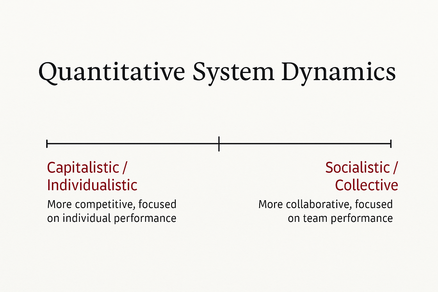 Capitalistic / Individualistic - More competitive, focused on individual performance Socialistic / Collective - More collaborative, focused on team performance